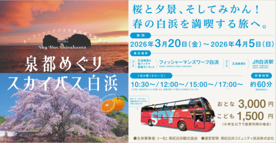 開催中のイベント情報 南紀白浜温泉に宿泊し豪華景品をGETしよう!「また来てね!~白浜湯めぐりスタンプラリー~」を開始します2025年10月1日~2026年3月31日観光地を周遊「泉都めぐりスカイバス白浜」を期間限定で運行!2026年3月20日(金)~2026年4月5日(日)3月25日(水)~4月5日(日)平草原公園 桜まつり2026年3月25日(水)~2026年4月5日(日)「泉都めぐり スカイバス白浜」× アドベンチャーワールド2026年3月28日(土)、29日(日)、4月4日(土)、5日(日) 4日間 計6便4/25 開催!第7回南紀白浜エアショー20262026年4月25日