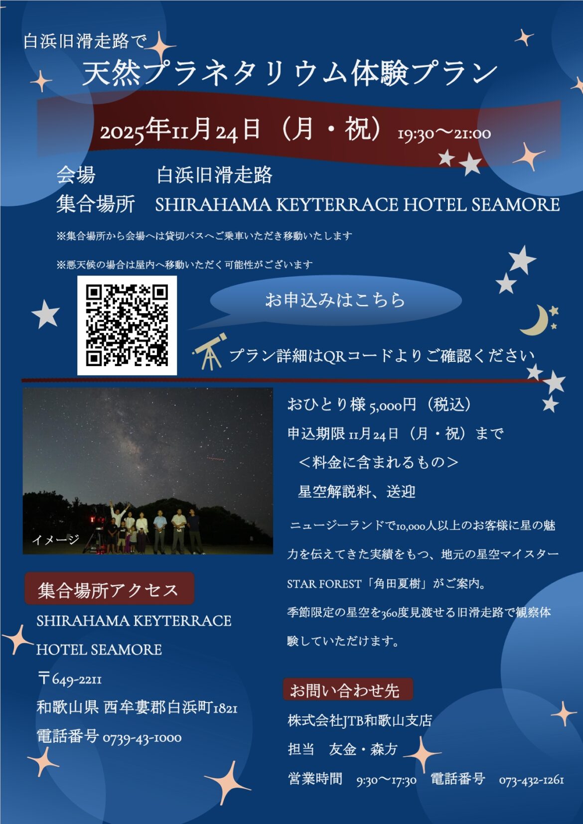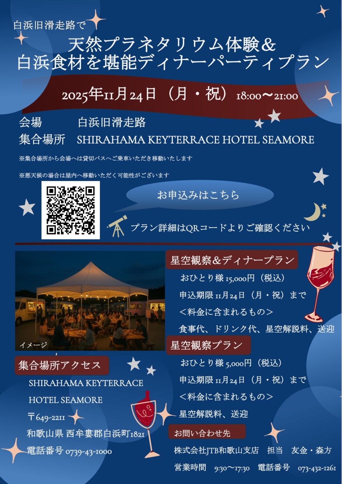 | 開催日時 | 2025年11月24日(月・祝) ①天然プラネタリウム体験プラン 19:30~21:00 ②天然プラネタリウム体験&白浜食材を堪能ディナーパーティプラン 18:00~21:00 |