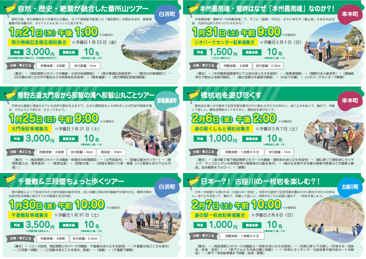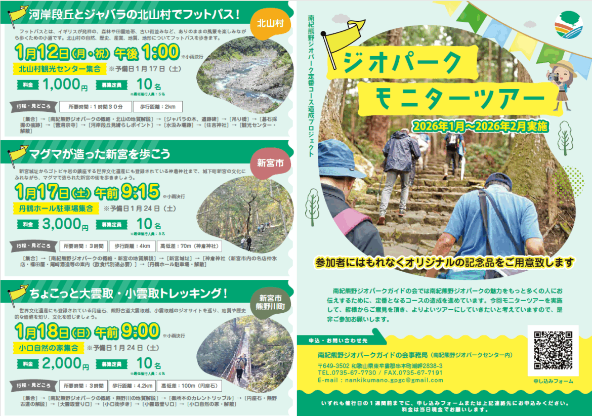 南紀熊野ジオパークガイドの会さまよりお知らせ)ジオパークモニターツアー参加者募集 公開日:2025年12月16日更新日:2025年12月16日 南紀熊野ジオパークガイドの会では、南紀熊野ジオパークの魅力をもっと多くのお客様にお伝えするために、定番となるコースの造成を進めています。今回、今後発信していく予定のツアーを9本企画し、一般の方にご参加いただき貴重なご意見をお聞きするためのモニターツアーを実施することとなりました。皆様のご参加、お待ちしております! お申し込み等詳細はこちら南紀熊野ジオパークガイドの会事務局 TEL.0735-67-7730 チラシダウンロード お知らせ