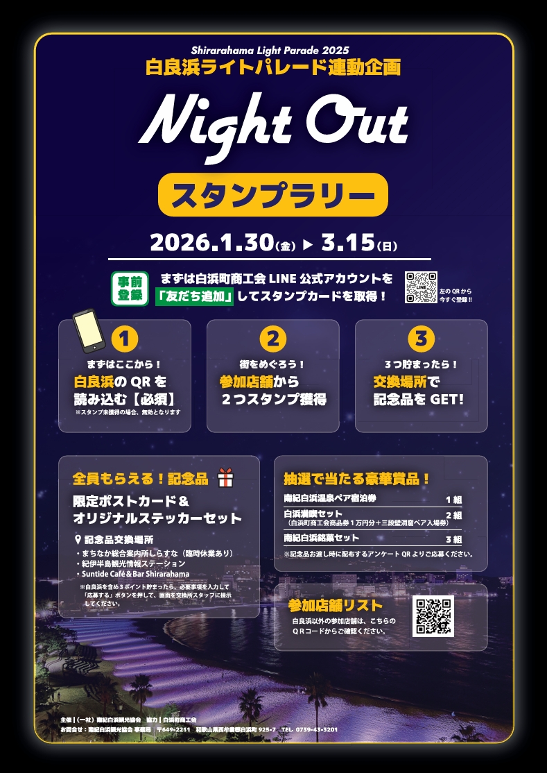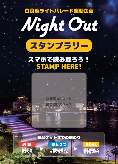 白良浜ライトパレードと周辺飲食店(下記参加店舗一覧をご覧ください)をめぐる、スタンプラリーを開催します。