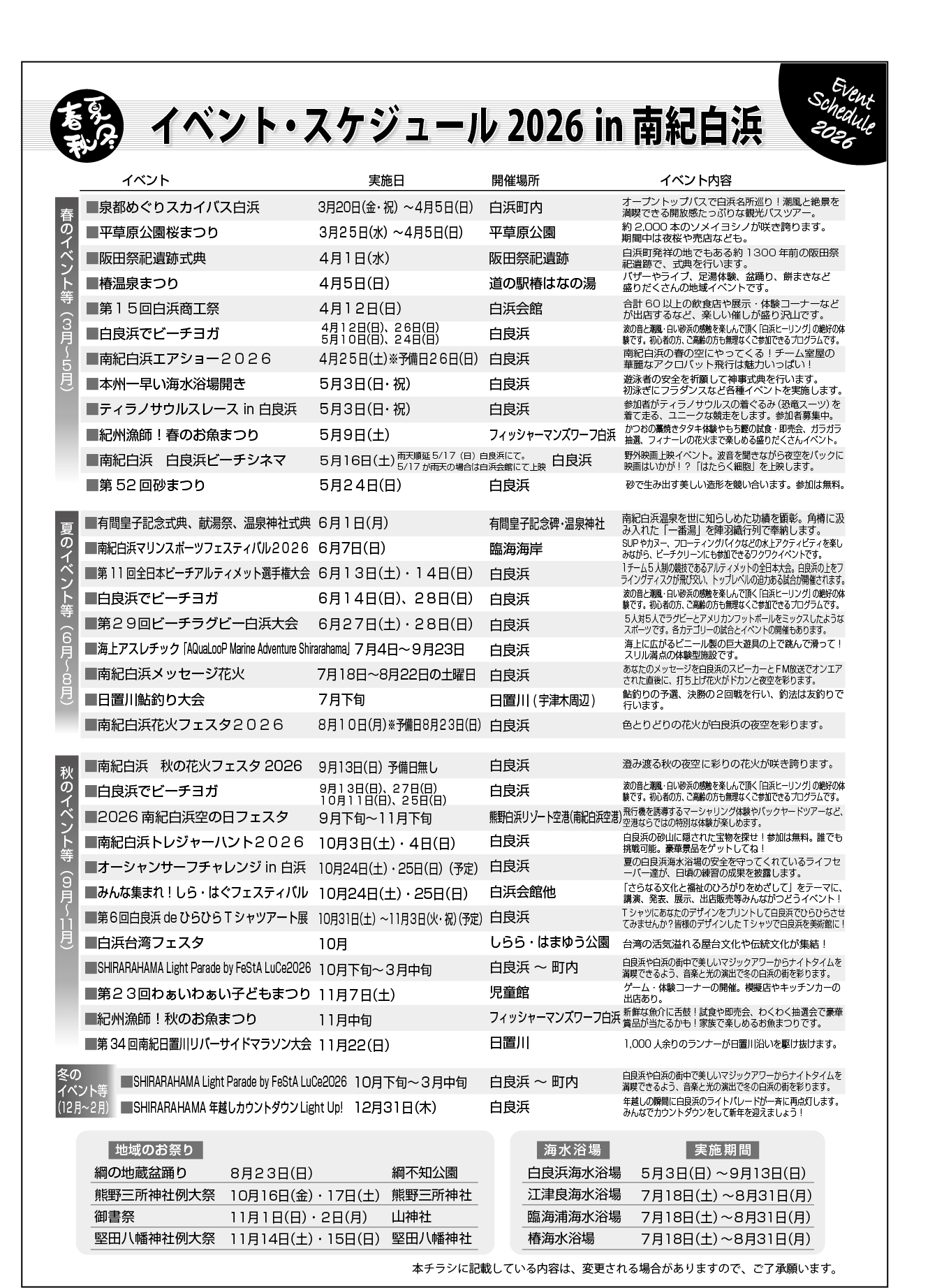 南紀白浜温泉2026 イベントスケジュール 公開日:2026年04月27日更新日:2026年04月27日 2026年度のイベントスケジュールをお知らせします。※尚、記載している内容は、今後変更される場合がありますので、ご了承願います。 イベントスケジュール2026ダウンロード お知らせ一人旅ファミリーカップル女子旅友人・グループ大人旅